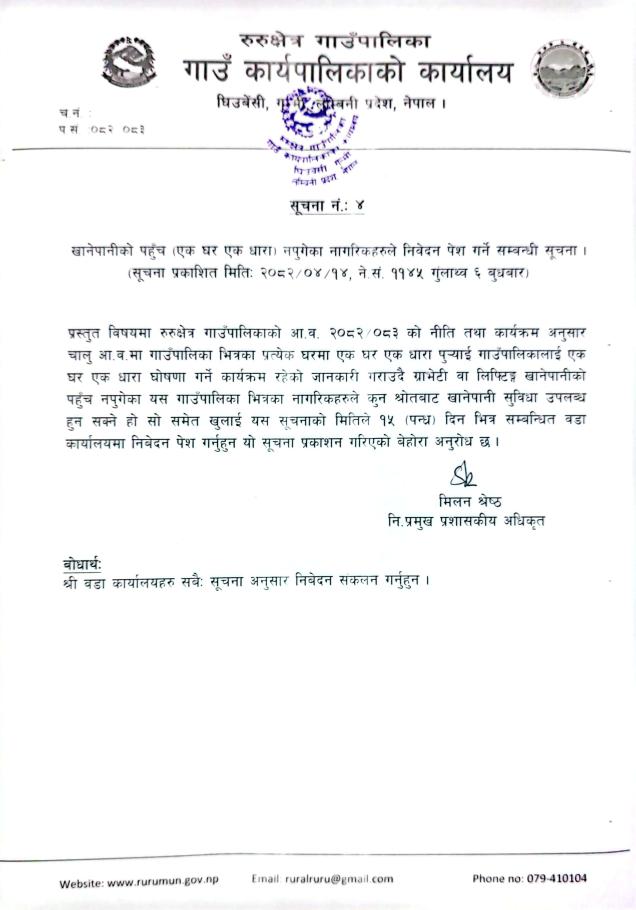 खानेपानीको पहुँच (एक घर एक धारा) नपुगेका नागरिकहरुले निवेदन पेश गर्ने सम्बन्धी सूचना !!