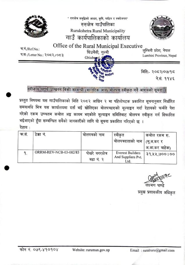 नदीजन्य पदार्थ उत्खनन् विक्री सम्बन्धी (आन्तरिक आय रुद्रवेणी बगरक्षेत्र) बोलपत्र स्वीकृत गर्ने आशयको सूचना ।।