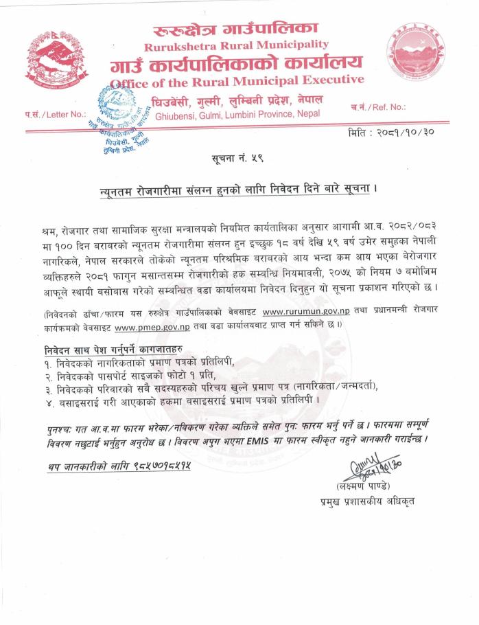 न्यूतम रोजगारीमा संलग्न हुनेको लागि निवेदन दिने बारे सूचना !!