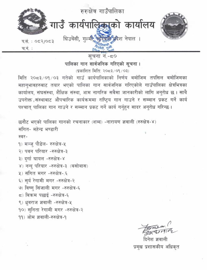 पालिका गान सार्वजनिक गरिएको सूचना ।।