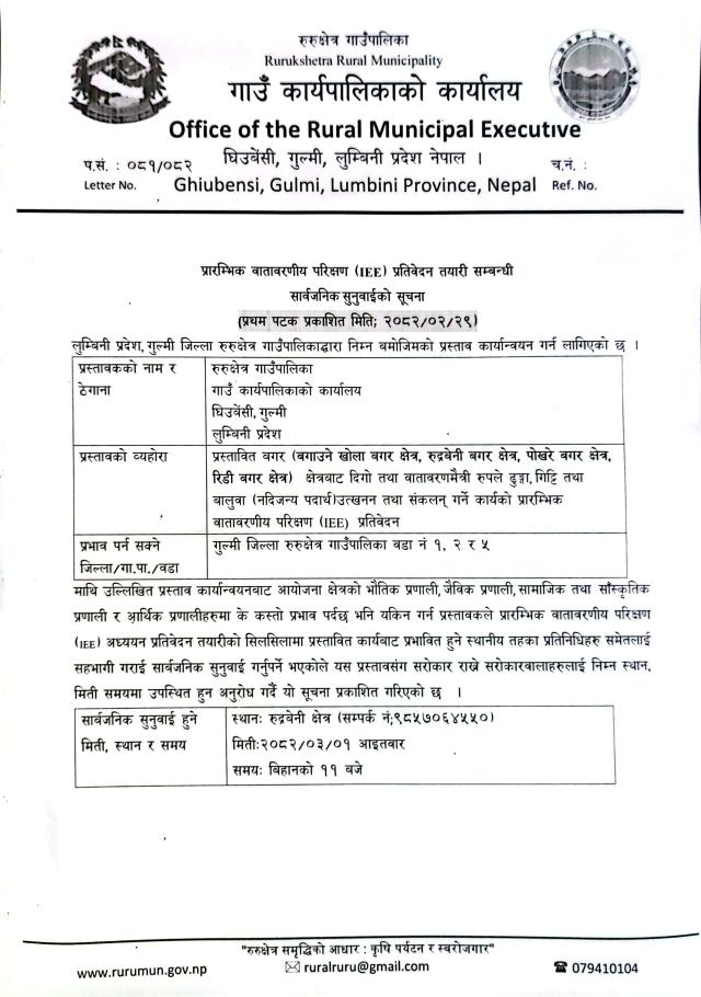 » प्रारम्भिक वातावरणीय परिक्षण (IEE) प्रतिवेदन तयारी सम्बन्धी सार्वजनिक सुनुवाईको सूचना ।।