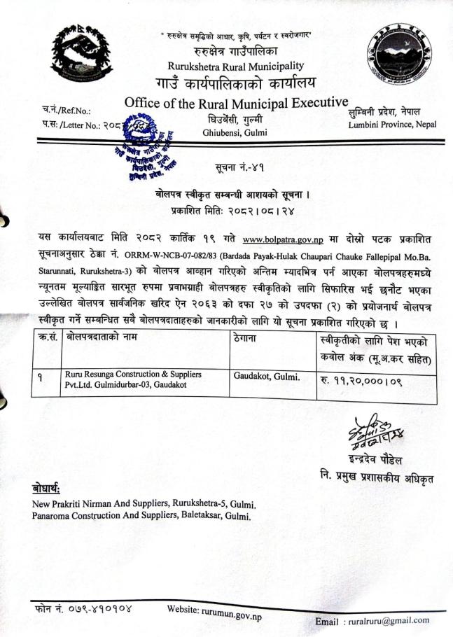 » बोलपत्र स्वीकृत सम्बन्धी आशयको सूचना