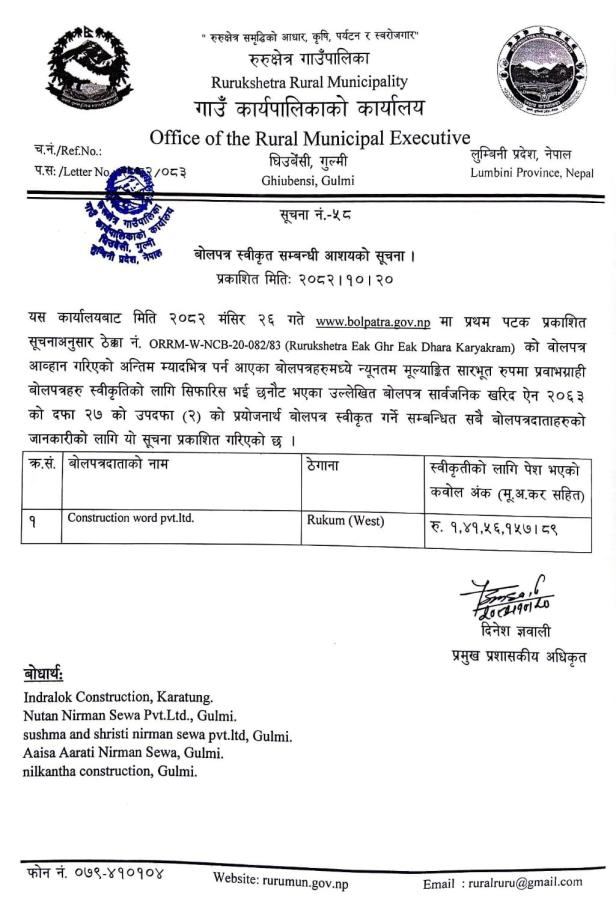 » बोलपत्र स्वीकृत सम्बन्धी आशयको सूचना।