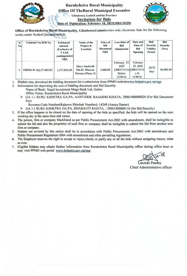 Invitation of Bids for Construction of Shree Janabodh Mavi Bhawan Nirman( phase 2)