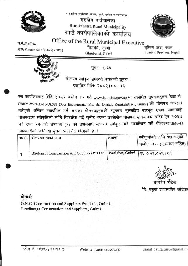 » बोलपत्र स्वीकृत सम्बन्धी आशयको सूचना ।।