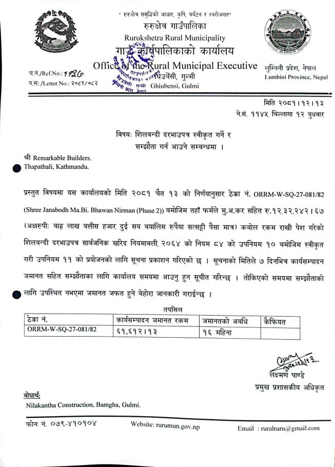 शिलबन्दी दरभाउपत्र स्वीकृत गर्ने र सम्झौता गर्न आउने सम्बन्धमा ।